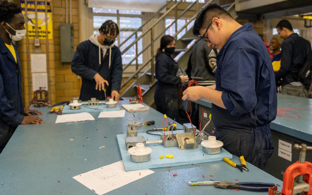 Top photo: A student at Bronx Design and Construction Academy in New York City learned electrical knowledge and skills through a career and technical education program. Bloomberg Philanthropies is working with the city to expand these programs and reach more students. Photo Credit: Courtesy of NYC Public Schools